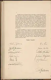 Image de la Déclaration (en finnois) avec les signatures des sénateurs. | ||