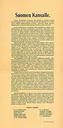 - « Le peuple de Finlande a, par cet acte, pris son destin entre ses mains ; un acte à la fois justifié et exigé par les présentes circonstances. Le peuple de Finlande ressent profondément qu'il ne peut remplir son devoir national et international sans une souveraineté totale. Le désir séculaire de liberté demande aujourd'hui à être comblé ; le peuple de Finlande s'avance comme une nation libre parmi les autres nations du monde.