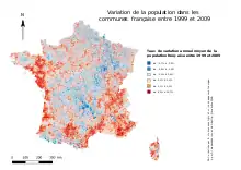 En France, le phénomène reste limité à 20 % environ des aires urbaines. Il concerne surtout les petites villes (deux mille à cinquante mille habitants), taille variant selon les institutions et les chercheurs)[3] et les villes moyennes (moins de cinquante mille habitants) situées dans les anciens bassins industriels (Lorraine, pourtour du Massif Central, Nord). Il est provoqué par une perte d'attractivité. Il se traduit par une baisse de la population. Cette baisse intervient depuis 1970 environ pour les grandes villes centres (Saint-Étienne, Le Havre), depuis 1990 environ pour les communes de périphérie. Cette décroissance n'est pas neutre socialement, car les populations aisées partent plus facilement ; elle provoque une paupérisation des habitats et des habitants, et une spécialisation ethnique[4].