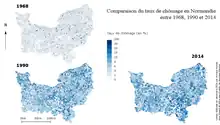 Le taux d'équipement permet de mesurer le "niveau d'équipement et de service rendus par un territoire à la population"[17] : en recensant le nombre d'équipements (commerciaux, de santé, de service, d'éducation ou encore de l'administration) et en divisant à la population puis en multipliant par 1 000[18]. Saint-Étienne, ville en déclin, est concurrencée par sa périphérie et l'augmentation croissante de la population dans les communes limitrophes. Cette carte permet d'avoir une représentation spatiale de l'évolution du taux d'équipement et donc d'avoir une idée des dynamiques d'aménagement sur ces territoires entre 2007 et 2016.