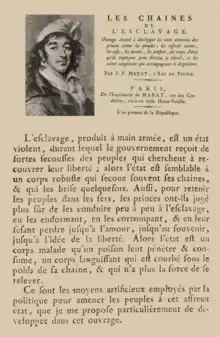 Jean-Paul Marat dans Les Chaînes de l'esclavage nous fait un récit de l'esclavage comme une forme de subjugation sur un groupe de personnes, un peuple, une nation. Cette force s'exerce en dehors de la propriété de la personne par le souverain, le tyran. Avec cette théorie, les nouveaux citoyens ne tombent-ils pas dans l'esclavage commun à la métropole et aux colonies ?