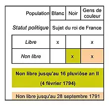 L'abolition du (16 pluviôse an II) dans les colonies de la République française est précédée par le décret du 16 octobre 1791 promulgué par l'Assemblée constituante de 1789-1791, portant que tout homme est libre en France, et que, quelle que soit sa couleur, il y jouit de tous les droits de citoyen, s'il a les qualités prescrites par la constitution[3]. L'article premier « Tout individu est libre aussitôt qu'il est entré en France » confirme le texte des Institutes coutumieres de Loysel, Livre premier, Titre I, Article VI, des personnes[4] : « Toutes Perſonnes ſont franches en ce Roiaume : & ſitoſt qu’un eſclave a atteint les Marches d’icelui, ſe faiſant baptizer, eſt affranchi » — sans la clause du baptême. L'article deuxième met hors la loi, dans la métropole, la hiérarchie anthropologique du préjugé de couleur et l'inégalité politique en vigueur dans les colonies en précisant : « Tout homme de quelque couleur qu'il soit jouit en France de tous les droits de citoyen s'il a les qualités prescrites par la constitution pour les exercer ». Ce décret du 16 octobre 1791 annule de facto les dispositions de Déclaration pour la police des noirs, Versailles, 9 août 1777 sans abolir l'esclavage, les inégalités politiques et sociales dans les colonies.