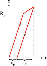 où ɛe est la déformation élastique, réversible (récupérable à la décharge), liée à la contrainte au travers de la loi d’élasticité (σ= Eɛe) et où ɛp la déformation plastique, irréversible ou résiduelle[1].
