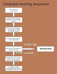 L’ordinateur exploite un programme réduit, le chargeur d'amorçage, permettant d’extraire un programme accessible via un périphérique de stockage permanent ou amovible. Ce dernier est typiquement le noyau du système d’exploitation, qui s’installera en RAM (la mémoire vive) et appellera lui-même des programmes applicatifs.