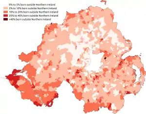 En 2001, 91,0 % de la population était née en Irlande du Nord, 7,2 % en république d'Irlande ou dans le reste du Royaume-Uni, et 1,8 % étaient nés ailleurs. En 2011, ces chiffres étaient respectivement de 89, 6,7 et 4,3 %. Les villes où habitent le plus d'immigrés ni Britanniques ni Irlandais étaient Belfast, suivie par Craigavon et Dungannon. La ville de Strabane a le plus faible taux d'immigrants[5].