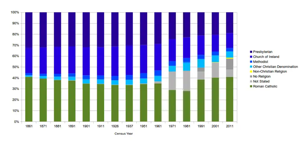 De la partition, en 1921 jusqu’au recensement de 1951, la proportion de catholiques est restée stable en Irlande du Nord, en partie à cause de l’émigration qui touchait particulièrement cette communauté. À partir de 1951, la proportion de catholiques a progressivement augmenté, au détriment de la majorité protestante[25],[26].