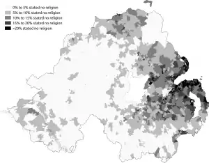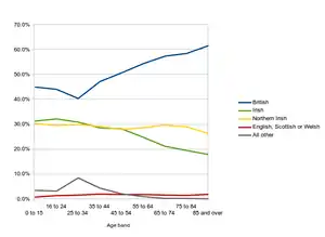 Il y a une forte corrélation entre religion et identité nationale, les catholiques se reconnaissant plus souvent irlandais et les protestants britanniques. Ce n'est pas une règle absolue, et les minorités catholiques dans les zones à majorité protestante ont plus souvent tendance à se reconnaître britanniques. La plupart des non-religious, athées, agnostiques ou sans religion se considèrent comme britanniques.