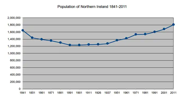 Le dernier recensement a eu lieu en 2011, et a dénombré 1 810 863 habitants, en augmentation de 125 800 (soit 7,5 %) depuis le recensement de 2001, 10 ans auparavant[3]. La densité de population est de 133 habitants par km², soit la moitié de celle du Royaume-Uni, mais deux fois celle de la république d'Irlande[4]. Plus d'un tiers de la population vit dans le grand Belfast.
