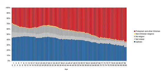 La natalité des catholiques est plus élevée que celle des protestants, et en 2001, la part de la population âgée de 0 à 4 ans appartenait pour 49,1 % à la communauté catholique contre 43,1 % à la communauté protestante. À l'inverse, les plus de 75 ans étaient à 69,2 % protestants et à 30,2 % catholiques.