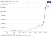 Le Japon comptait 125 929 817 habitants en 2020[15] avec un des taux de natalité les plus bas du monde[16]. Durant l'année 2016 l'archipel a perdu environ 300 000 habitants. Cette baisse de la population a atteint un niveau record depuis l'existence en 1968 des statistiques[17]. C'est la sixième année consécutive que le pays voit sa population baisser. Mais la population va encore baisser de près de 300 000 habitants en 2017, cette chute s'accélérant à l'avenir pour faire tomber la population à moins de 85 millions en 2050. En effet, près de 35 % de la population aura plus de 60 ans fin 2018, soit plus de 90 ans fin 2048[18].
