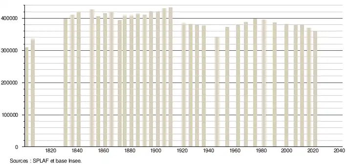 (Sources : SPLAF - population totale du département depuis sa création jusqu'en 1962[5] − puis base Insee − population sans doubles comptes de 1968 à 2006[6] puis population municipale à partir de 2006[7].)