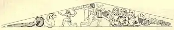 Fragments du fronton du temple archaïque dit Hécatompédon « temple de cent pieds », situé sur l'acropole d'Athènes, à l'emplacement du Parthénon actuel et démoli en -490, après la victoire de Marathon. À cette place se sont donc succédé trois temples : l'Hécatompédon (avant -490), puis le très éphémère Préparthénon (de -490 à -480, inachevé), enfin le Parthénon. Monstre à triple corps et queue de serpent. Le premier monstre apporte l'eau, le second, le feu et le troisième, l'air.