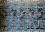 Frise de briques siliceuses à glaçure multicolore, provenant du palais de Darius Ier à Suse (Iran). Fouilles Marcel Dieulafoy, 1885–1886. Musée du Louvre, base Collections Aile Sully, rez-de-chaussée, salle 307 |