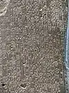 ![]() Détail de l'inscription Code de Hammurabi, roi de Babylone Hauteur : 2,25 m Exposé sur l'acropole de Suse parmi d'autres chefs-d'oeuvre mésopotamiens prestigieux. Fouilles Jacques de Morgan, acropole de Suse, hiver 1901 - 1902. Musée du Louvre, base Collections Aile Richelieu, rez-de-chaussée, salle 227 |
