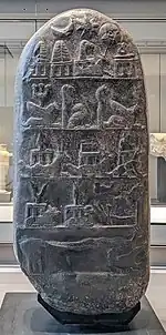 Stèle inscrite au nom du roi Melishipak II. Les différents symboles et animaux sculptés sur cette stèle, aussi appelée "kudurru", représentent les principales divinités du panthéon kassite. Le texte, en akkadien cunéiforme, rapporte une donation de terres faite par le roi Melishipak à son fils Marduk-apla-iddin. Hauteur : 65 cm ; Largeur : 30 cm Musée du Louvre, base Collections Aile Richelieu, rez-de-chaussée, salle 227 |