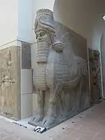 ![]() Lamassus du palais de Khorsabad ou Taureau androcéphale ailé Haut-relief et ronde-bosse, albâtre gypseux Hauteur : 4,20 m ; longueur : 4,36 m. Fouilles Paul-Émile Botta 1843-1844 Musée du Louvre, base Collections Aile Richelieu, rez-de-chaussée, salle 229 |