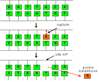 Si les dépurinations et dépyrimidinations spontanées sont des altérations indésirables, leurs analogues provoqués font par contre partie de la vie normale des cellules : lorsque des bases nucléotidiques sont endommagées, elles sont autant que possible réparées grâce au système de réparation par excision de base (BER, base excision repair). La première étape de ce processus de réparation est l'extraction des bases endommagées (déglycosilation) par des enzymes spécialisées, les glycosylases, ce qui permet de les remplacer ensuite par des bases intactes[5].