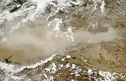 Les vents de Nord et de Nord-Ouest, prédominants en été dans les régions de l'Ouest du désert, forment une circulation complexe des masses d'air à leur point de convergence — près du centre du désert, à proximité de la Keriya — ce qui influence fortement la topographie des dunes de sable. Au printemps, de forts courants ascendants se forment en raison du réchauffement des sols, ce qui engendre des vents de Nord-Est pouvant s'avérer très puissants. Pendant cette période, ces derniers — mêlés aux vents provenant d'autres directions — génèrent de fréquentes tempêtes de sable qui remplissent l'atmosphère de poussière et ce, jusqu'à 4 000 mètres d'altitude[5].