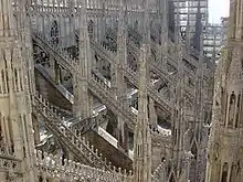 La couverture de la terrasse (elle aussi en marbre) est un unicuum dans l’architecture gothique elle est soutenue par un double croisement de voûtes mineures. En concordance des piliers se lève une « forêt » de pinacles reliés entre eux par des arcs-boutants. Dans cette configuration les pinacles n’ont aucune fonction de structure puisqu’ils ont pratiquement tous été rajoutés durant la moitié du XIXe siècle. Dans la gravure de Bernardo Zenale datant de 1519 (qui se trouve au Musée du Duomo) ainsi que dans d’anciens dessins, un arêtier central devait mettre en évidence la forme triangulaire mais il est exclu dans le projet de 1836[3].