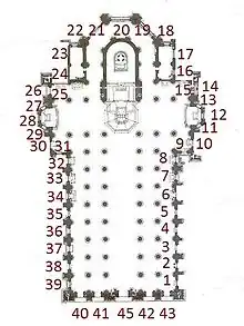- Nombre de statues : 3 400[3] dont 2 300 à l’extérieur (sans compter les demi-figures dans les embrasures des fenêtres, les 96 gargouilles et les hauts-reliefs)[6]