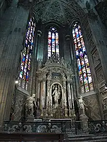 La caractéristique particulière du Duomo de Milan, en plus de son compromis entre la verticalité de la forme gothique et l'horizontalité de la tradition lombarde, est l’extraordinaire abondance de sculptures[1]. C’est une exceptionnelle collection de statues allant du XIVe au XXe siècle et sculptées par de grands maîtres : maestri campionesi (Giovannino dei Grassi), puis avec un style plus doux et cosmopolite des maîtres bohèmes (Michelino da Besozzo), puis sculptures de la Renaissance, baroque, néoclassique pour finir sur des œuvres Art déco des années 1920 et 1930[3].