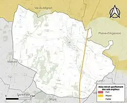 Le retrait-gonflement des sols argileux est susceptible d'engendrer des dommages importants aux bâtiments en cas d’alternance de périodes de sécheresse et de pluie. 0,1 % de la superficie communale est en aléa moyen ou fort (54,2 % au niveau départemental et 48,5 % au niveau national). Sur les 240 bâtiments dénombrés sur la commune en 2019, aucun n'est en aléa moyen ou fort, à comparer aux 57 % au niveau départemental et 54 % au niveau national. Une cartographie de l'exposition du territoire national au retrait gonflement des sols argileux est disponible sur le site du BRGM[12],[Carte 2].