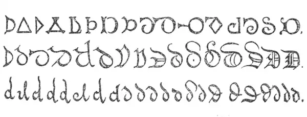 Formes majuscules et minuscules manuscrites de la lettre D dans le Dictionnaire des abréviations latines et française d’Alphonse Chassant.