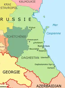 Néanmoins, le Daghestan n'a, contrairement à la Tchétchénie, jamais exprimé de velléités sécessionnistes, du fait notamment de sa population (une mosaïque d’une trentaine d’ethnies et de langues), qui a fait preuve d’unité face à la déstabilisation du pays par les militants tchétchènes[9].