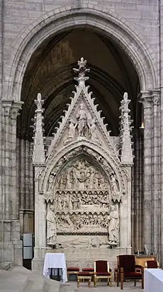 Au XIIIe siècle, les moines de Saint-Denis voulurent imposer leur basilique comme nécropole royale et rendre hommage au roi Dagobert en réalisant, pour sa dépouille, un tombeau exceptionnel adoptant la forme d'un enfeu à haut pignon dont le fond est traité comme un tympan. Mais la sulfureuse réputation du bon roi les fit trembler. Ils imaginèrent donc une sculpture un peu ambigüe et qui se lit dans la pierre comme une bande dessinée. Le roi est représenté en gisant couché de flanc, les mains jointes, le regard tourné vers le tombeau des trois martyrs, ses patrons, sur un lit entouré de deux statues (Nanthilde, son épouse et Clovis II, son fils, tenant le plan relief de la basilique). Ces statues et le gisant sont des restitutions de Viollet-le-Duc.