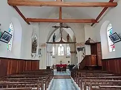 - L'église Saint-Denis[39], construite en limite du village sur un site légèrement dominant, une des rares églises du secteur à avoir conservé des pafrties du XIIIe siècle et qui a fait l'objet de travaux en 2015-2016, avec des vitraux de belle facture dont un dédié à Jeanne d'Arc, une poutre de gloire spiralée en bois de 1762 qui sépare le chœur et la chapelle seigneuriale, et supporte un Christ en croix avec saint Jean et Marie[40],[21], des fonts baptismaux de la fin du XII e ou du début du XIIIe siècle[41], un harmonium rénové, et un ensemble inspirant la paix de ce petit village.