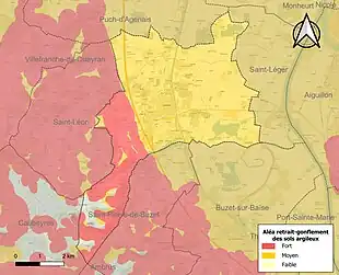 Le retrait-gonflement des sols argileux est susceptible d'engendrer des dommages importants aux bâtiments en cas d’alternance de périodes de sécheresse et de pluie[21]. 96,9 % de la superficie communale est en aléa moyen ou fort (91,8 % au niveau départemental et 48,5 % au niveau national)[Carte 2]. Depuis le , en application de la loi ELAN, différentes contraintes s'imposent aux vendeurs, maîtres d'ouvrages ou constructeurs de biens situés dans une zone classée en aléa moyen ou fort[Note 3],[22].