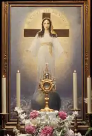 - La dame se tient devant la Croix, car « il va survenir sur le monde une grande lutte spirituelle et de nouveau, l'humanité est appelée à retourner à la Croix ». La Mère « nous introduit dans un temps nouveau, le temps du Saint-Esprit ». Elle veut faire venir maintenant le Saint-Esprit sur les peuples, c'est pourquoi elle se tient devant la Croix comme « Corédemptrice, Médiatrice et Avocate »[11].