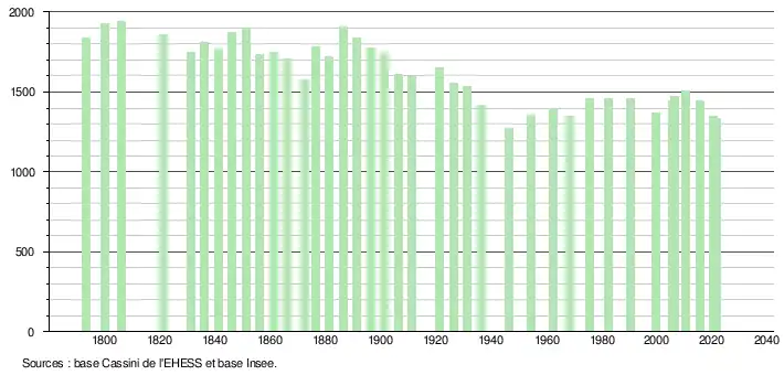 L'évolution du nombre d'habitants est connue à travers les recensements de la population effectués dans la commune depuis 1793. Pour les communes de moins de 10 000 habitants, une enquête de recensement portant sur toute la population est réalisée tous les cinq ans, les populations légales des années intermédiaires étant quant à elles estimées par interpolation ou extrapolation[27]. Pour la commune, le premier recensement exhaustif entrant dans le cadre du nouveau dispositif a été réalisé en 2005[28].