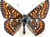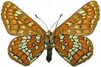C'est un papillon marron à damiers orange séparés par les nervures et organisés en lignes, dont une ligne sub marginale continue aus antéreieures et aux postérieures doublée d'une ligne de petits damiers blancs. Les ailes antérieures présentent des damiers orange sur toute leur surface.