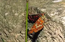 Le Damier du frêne, Mélitée du Frêne, Petit Damier à taches fauves, Maturne se nomme en anglais Scarce Fritillary et en allemand Kleiner Maivogel.