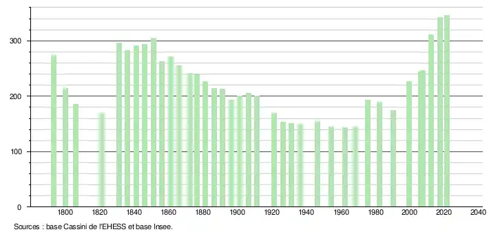 L'évolution du nombre d'habitants est connue à travers les recensements de la population effectués dans la commune depuis 1793. Pour les communes de moins de 10 000 habitants, une enquête de recensement portant sur toute la population est réalisée tous les cinq ans, les populations légales des années intermédiaires étant quant à elles estimées par interpolation ou extrapolation[16]. Pour la commune, le premier recensement exhaustif entrant dans le cadre du nouveau dispositif a été réalisé en 2007[17].