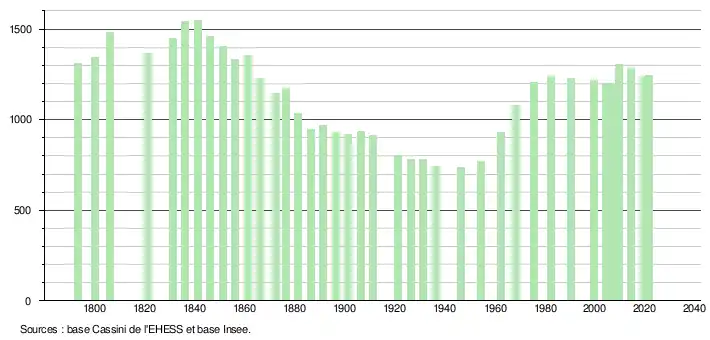 L'évolution du nombre d'habitants est connue à travers les recensements de la population effectués dans la commune depuis 1793. Pour les communes de moins de 10 000 habitants, une enquête de recensement portant sur toute la population est réalisée tous les cinq ans, les populations légales des années intermédiaires étant quant à elles estimées par interpolation ou extrapolation[18]. Pour la commune, le premier recensement exhaustif entrant dans le cadre du nouveau dispositif a été réalisé en 2004[19].