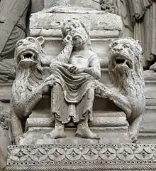 - Les lions : Le nombre de lions varie entre deux et sept et leur forme est rarement naturaliste. Sans doute peu de sculpteurs ont-ils eu l’occasion d'en voir. L'Antiquité aimait à les montrer prosternés, léchant le sol ou bien les pieds du prophète et, lorsque nous retrouvons ce schéma au XIIe siècle, nous pouvons le considérer comme un archaïsme. Habituellement les lions sont disposés de façon naturelle, en mode affronté ou adossé-détourné. Dans leur majorité les bêtes ont la queue rentrée remontant entre les cuisses et souvent terminée fleurdelisée.