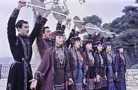 La danse Mtioulouri (მთიულური) vient de la région montagneuse de Mtioulétie, située au Nord de la Géorgie. Elle illustre la compétition entre deux groupes d’hommes, célébrant l’habileté et l’adresse[26].