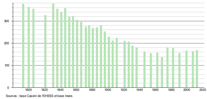 L'évolution du nombre d'habitants est connue à travers les recensements de la population effectués dans la commune depuis 1793. À partir du , les populations légales des communes sont publiées annuellement dans le cadre d'un recensement qui repose désormais sur une collecte d'information annuelle, concernant successivement tous les territoires communaux au cours d'une période de cinq ans. Pour les communes de moins de 10 000 habitants, une enquête de recensement portant sur toute la population est réalisée tous les cinq ans, les populations légales des années intermédiaires étant quant à elles estimées par interpolation ou extrapolation[15]. Pour la commune, le premier recensement exhaustif entrant dans le cadre du nouveau dispositif a été réalisé en 2007[16],[Note 2].