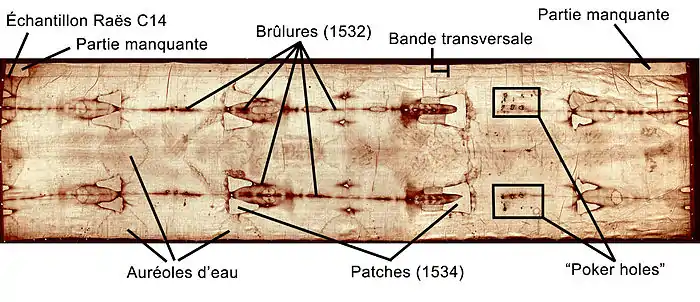 - Les échantillons confiés aux laboratoires pèseraient 28 mg, ce qui équivaut à un morceau de 9 cm2 du suaire[20] ;