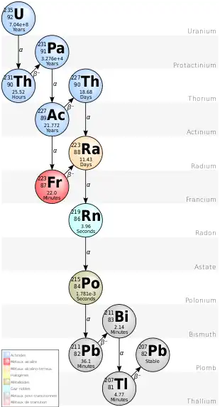 Dans un système fermé, la désintégration des atomes d'uranium a pour conséquence la formation d'éléments intermédiaires en équilibre séculaire et l'accumulation du produit stable final, plomb 206 et plomb 207[1]. Dans un système ouvert en revanche, comme les différents éléments n'ont pas les mêmes propriétés physico-chimiques, certains éléments sont séparés de leur père et leur quantité ne fait dès lors que décroitre. Connaissant la constante de désintégration et la quantité initialement présente de l'élément séparé dans l'échantillon, on peut alors déterminer son âge en en mesurant la quantité restante[1]. En pratique, seules les chaînes de désintégration de l'uranium sont utilisées, celle du thorium 232 ne comptant que des éléments à vie brève[alpha 1].