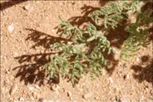 C'est une plante annuelle[7] ou bisannuelle[8], de 5 à 30 cm, dressée ou rampante-décombante, entièrement scabre et pubescente de poils courts rétrorses de plus ou moins 0,5 mm. Les feuilles sont scabres et hispides, 3 à 4 pennatiséquées, à 4 ou 5 paires de segments divisés, à lobes filiformes, obtus, larges de 0,2 à 0,3 mm, les feuilles caulinaires semblables et réduites[7].