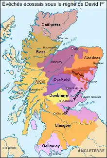 L'évêché de Glasgow est plus vraisemblablement restauré qu'entièrement recréé[98]. David y nomme son chapelain français Jean[99], et lui octroie l'ensemble des terres de sa principauté de Cumbria, à l'exception de celles situées à l'est et déjà gouvernées par l'évêque de Saint Andrews[Note 7]. David est un peu intervenu pour forcer les « évêchés » semi-monastiques de Brechin, Dunkeld, Mortlach (Aberdeen) et Dunblane à devenir totalement épiscopaux et s'intégrer dans le système national des diocèses[100].