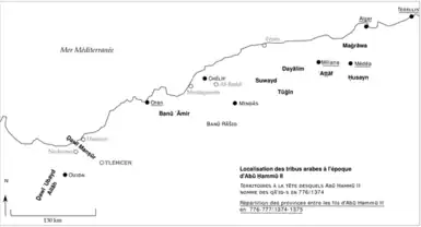 Les Dawi ’Ubayd-Allah demeurent à côté des Beni Amer et reconnaissent l’autorité des Beni ‘Abd al-Wad (Zianide), dynastie zenatienne. Le territoire qu’ils occupent s’étend de Tlemcen à Oujda, et de là jusqu’à l’embouchure du Moulouya, puis, vers le midi jusqu’à la source du Za. Quand ils entrent dans le Désert, ils poussent jusqu’aux bourgades de Touat et de Tamantît ; mais, quelquefois, ils font un détour à gauche pour atteindre Tasabît et Tigurarîn. Tous ces endroits servent de point de départ aux caravanes qui se rendent en Soudan.
