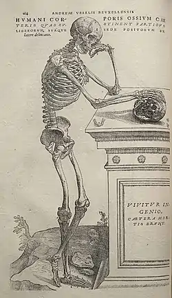 L'une des particularités de De humani corporis fabrica est sa richesse d'illustration, d'une grande qualité graphique. Il contient en tout 277 planches gravées sur bois, accompagnées de leur commentaire, soit en pleine page, soit de moindre dimension, dont une série de 25 planches hors-texte, hautes de 34 cm[8], représentant chacune un écorché prenant une pose devant un paysage en arrière-plan.
