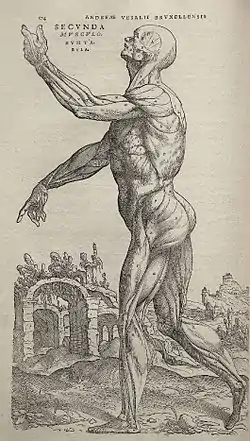 Le caractère « révolutionnaire » de l'ouvrage s'exprime surtout par l'illustration. On y trouve la mise en scène, devant un paysage en perspective, d'un objet anatomique qui est en même temps le sujet d'une attitude ou d'un mouvement, instaurant une force dramatique[12]. Une telle image était déjà apparue avec Berengario da Carpi (1521), mais la technique graphique est bien supérieure, elle bénéficie de l'orientation naturaliste de la peinture italienne de l'époque[17].