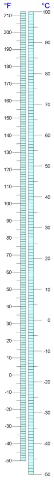 Fahrenheit observa que, dans son échelle, l’eau gèle, à pression atmosphérique normale, à 32 degrés et bout à 212 degrés[6], soit une différence de 180 degrés.