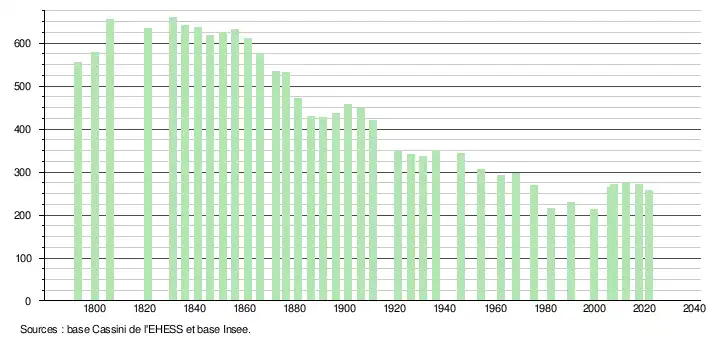 L'évolution du nombre d'habitants est connue à travers les recensements de la population effectués dans la commune depuis 1793. Pour les communes de moins de 10 000 habitants, une enquête de recensement portant sur toute la population est réalisée tous les cinq ans, les populations légales des années intermédiaires étant quant à elles estimées par interpolation ou extrapolation[22]. Pour la commune, le premier recensement exhaustif entrant dans le cadre du nouveau dispositif a été réalisé en 2007[23].