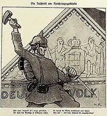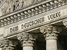 L'architecte Paul Wallot choisit l'inscription sur le pignon Dem deutsche Volke comme signature au bâtiment du Reichstag qu'il conçoit et achève en 1894, ce qui a déclenché un débat au parlement et dans la presse. Le Berliner Lokal-Anzeiger nomme le plan : « naïf, presque comique » car le propriétaire de la maison est le bâtisseur[1],[2]. Selon le politologue Klaus von Beyme, Kaiser Wilhelm rejette le tournant parce qu'il honore la souveraineté populaire[3]. Un certain nombre de contre-idées sont avancées : la Commission du bâtiment du Reichstag propose « Dem Deutschen Reiche »[4]. L'historien de l'art Bernd Roeck estime que la proposition de Wilhelm est une devise pour un bâtiment qui doit « apprivoiser, discipliner, au moins intégrer »[5]. Le 1er décembre 1894, le représentant Friedrich von Payer aborde le sujet de l'inscription dans un discours du Reichstag et critique le fait que son absence n'est pas propice à l'unité. Il soupçonne que l'absence est due aux sensibilités du Bundesrat et suggère d'inscrire : « Dem deutschen Volke und seinem hehren Bundesrat ».